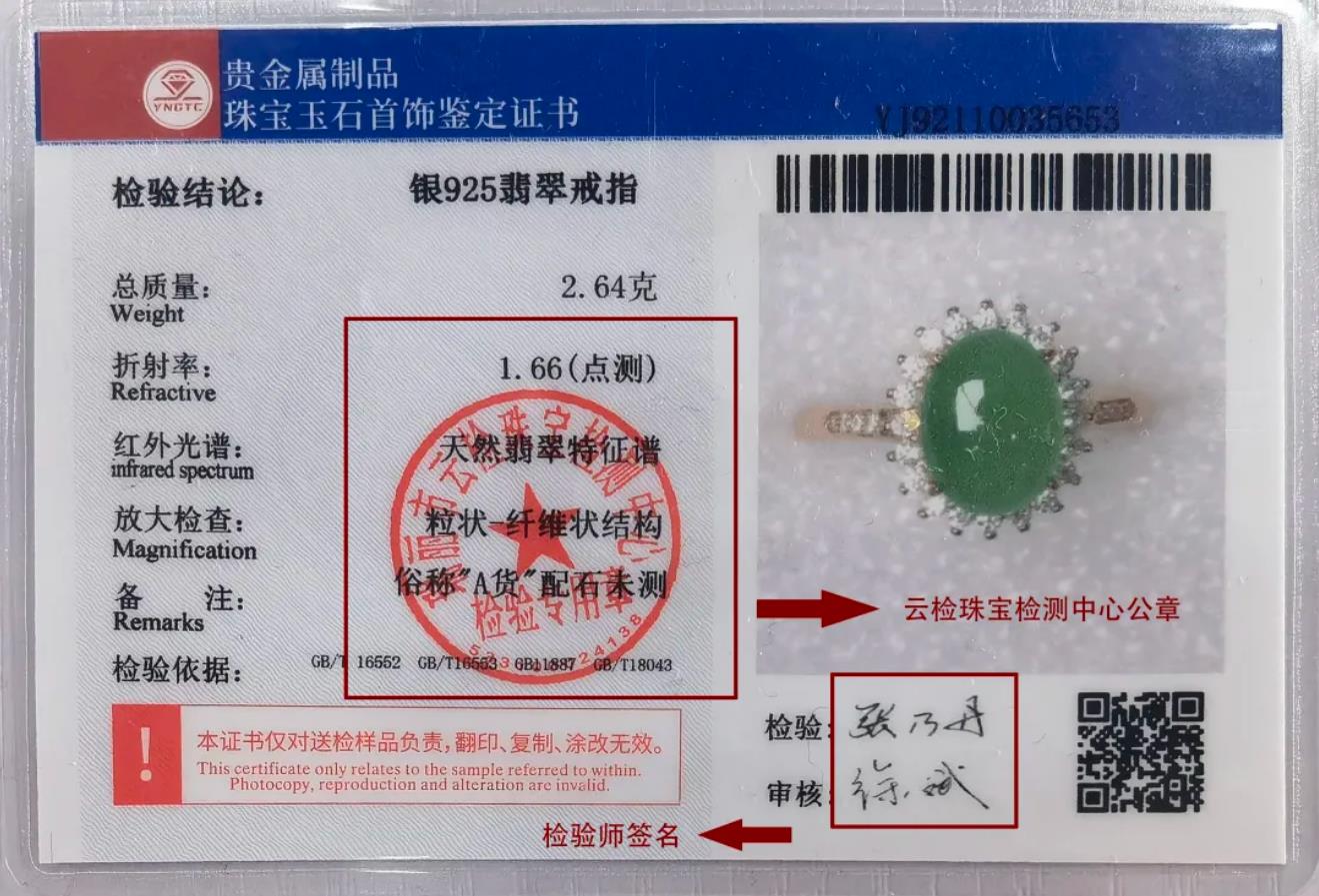 龙珠直播珠宝玉石首饰鉴定证书背面有单位公章和检验师签名