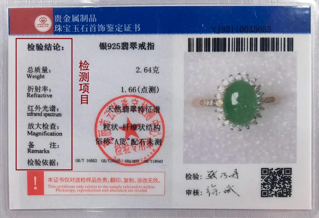 龙珠直播珠宝玉石首饰鉴定证书背面有“检测项目”